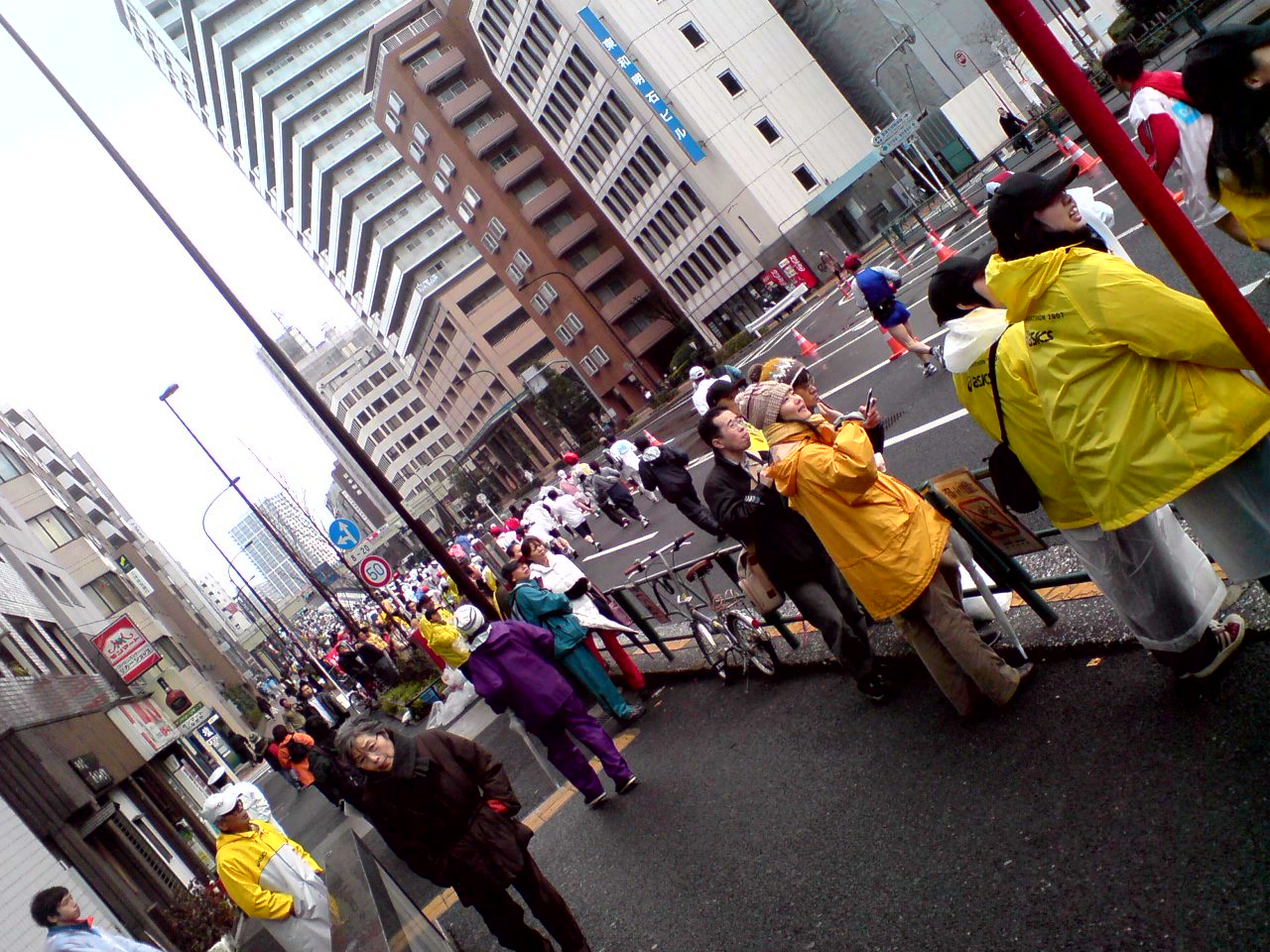色々物色している最中に、見知らぬ人から「良いメイド喫茶知りません?」とか話しかけられるのも嫌なので(実話)、とりあえず歩きながら考えようか・・・と新大橋通りを都心へ向けて歩いていたのですが、隅田川を渡る手前で交通規制が始まっていて、せっかくだからマラソンを観戦していこうと思い立ったわけです。