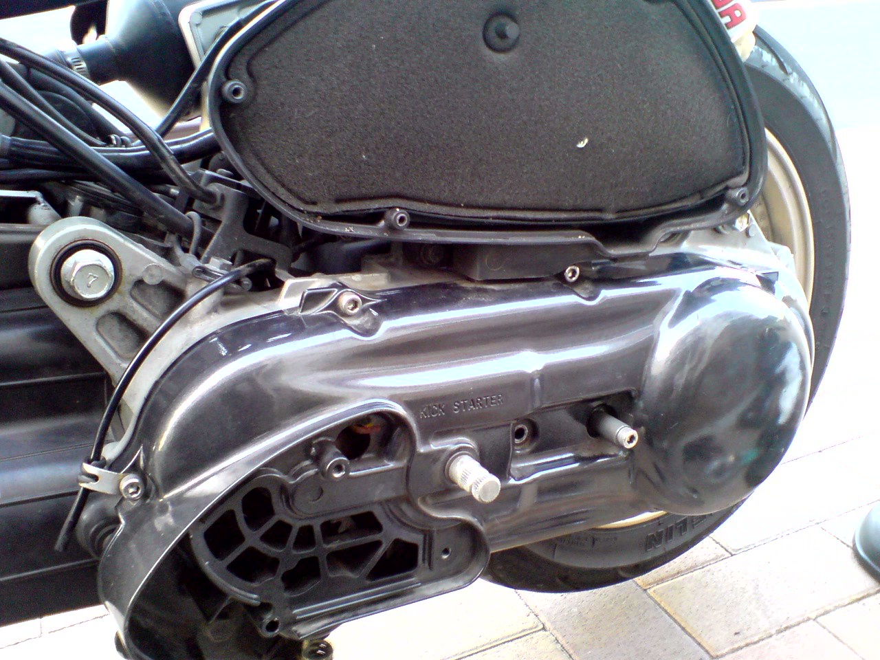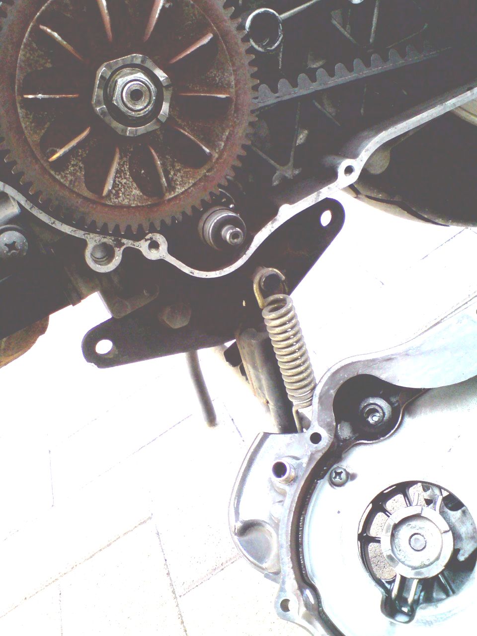 カバー中心部にある円形の部品、これはキックスターターのペダルに繋がるカップリングでして、キックする側に回ったときだけプーリーと繋がり、その逆はスリップするようになっているのですが、プーリーとカップリングの間に緩んだボルトが挟まって悪さしていた・・・というのが今回のトラブルの原因でした。
